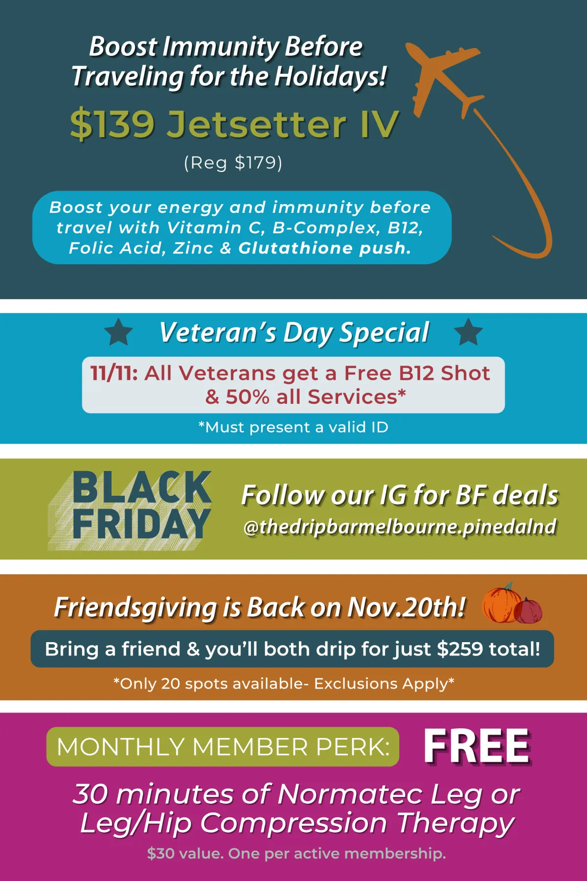 We have several top selling drips which include the Soother for relaxation, the Shield for immune support, the Powerpack for increased energy, and the NAD+ for anti-aging.